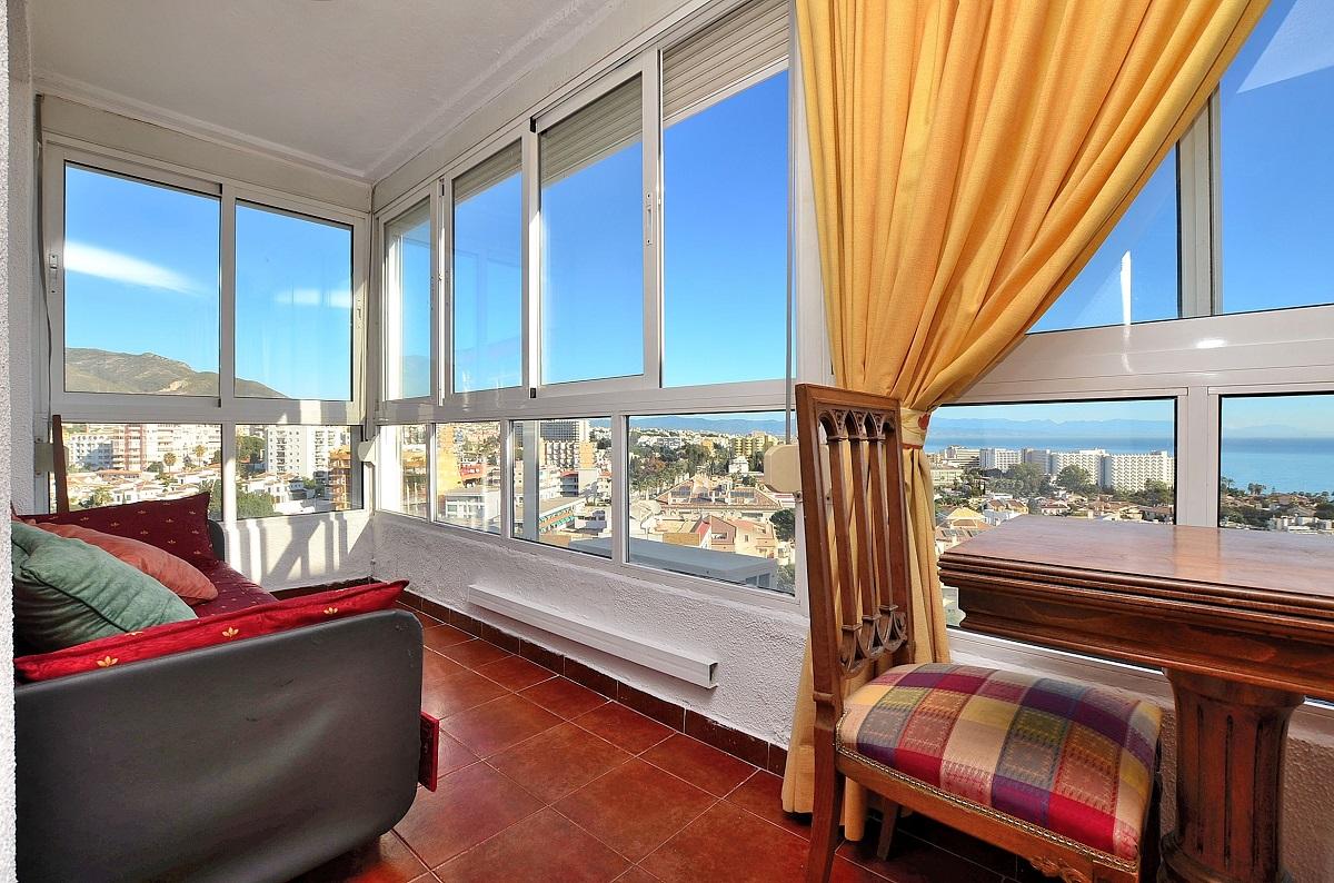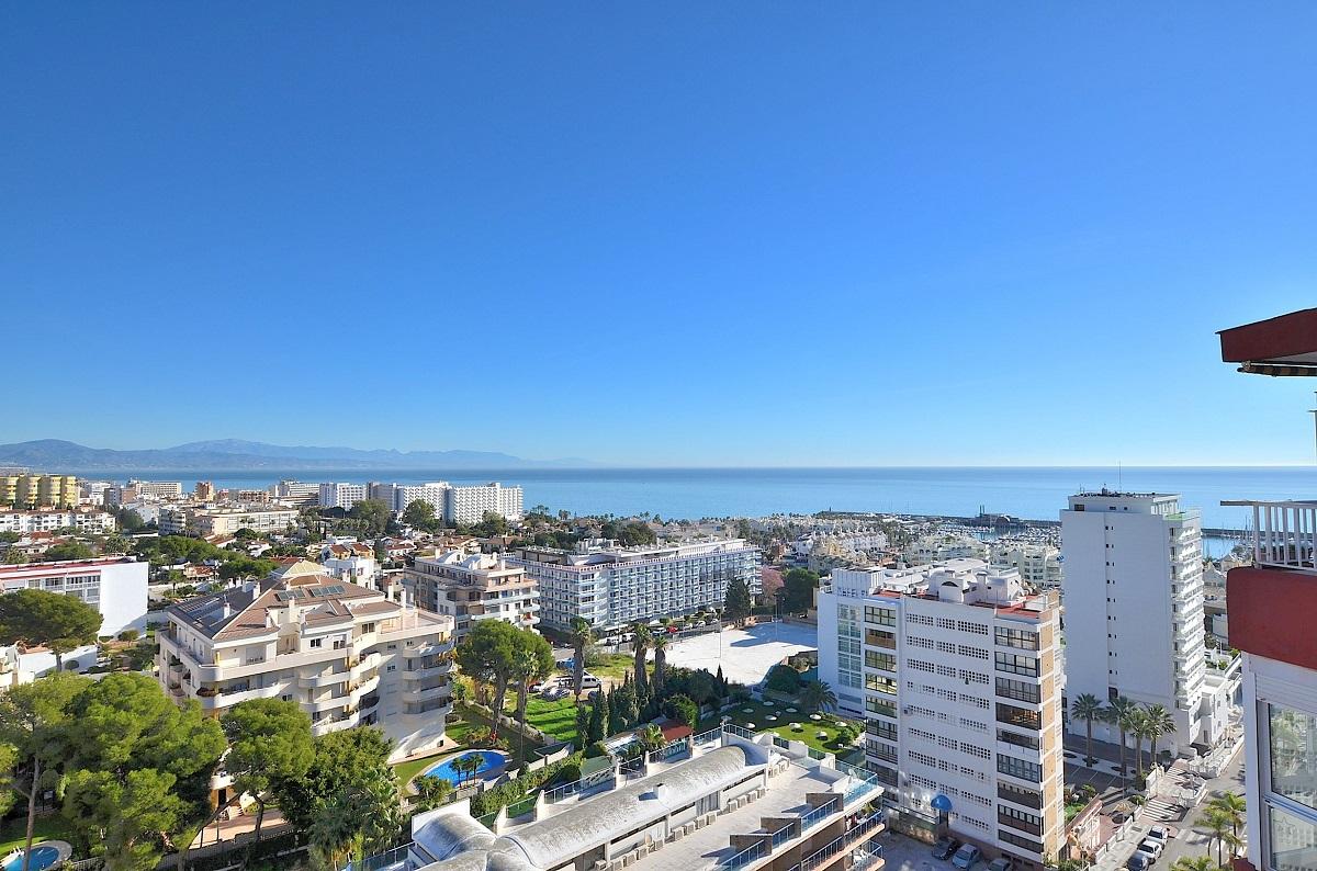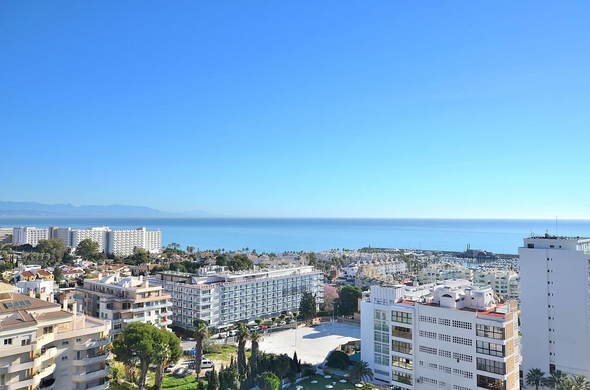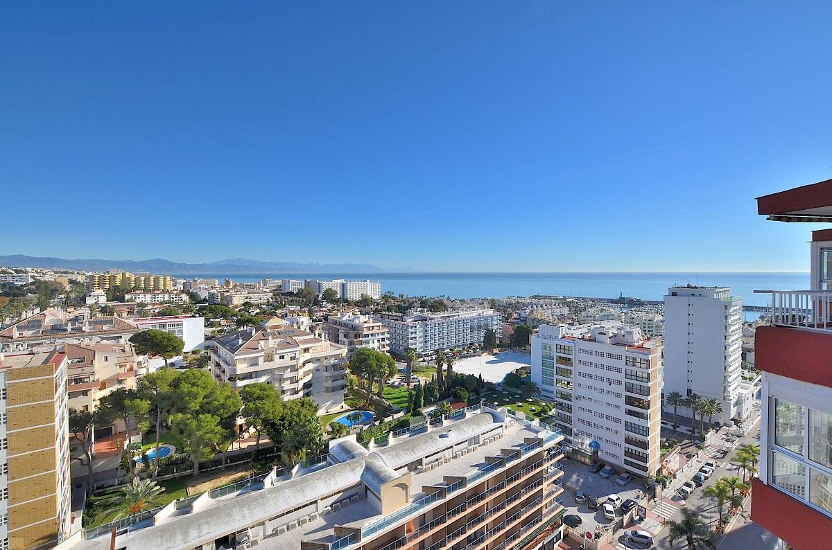Magnifico apartamento con espectaculares vistas al mar. A tan solo 100 metros de la playa y junto a Puerto Marina.PLANTA 13º. 63 m2. La vivienda se distrivuye en salon comedor, cocina independiente amueblada, 2 dormitorios con armarios empotrados, terraza acristalada. Vivienda en muy buen estado , aire acondicionado en todas las estancias. El complejo dispone de piscina comunitaria y amplias zonas ajardinadas con acceso directo a la playa desde la urbanizacion.