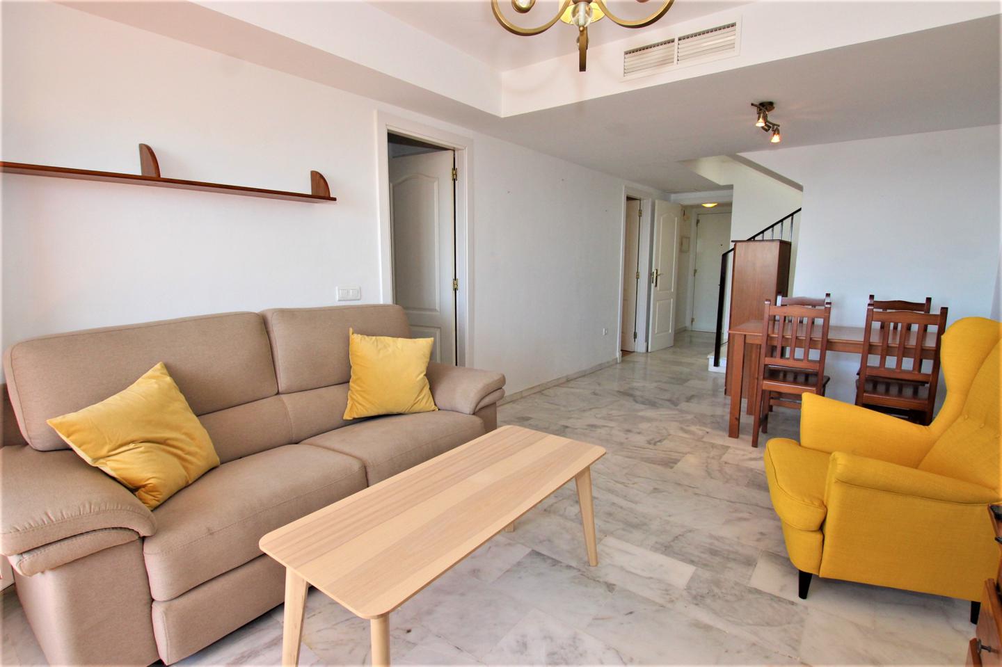 BENALMÁDENA ATICO-DUPLEX VISTAS AL MAR!! Precioso Atico-duplex situado en la zona de Santangelo. 120 m2 construidos. Se divide en 2 plantas. Planta principal: Porche de entrada, cocina independiente amueblada, salon comedor, 2 dormitorios y 1 baño suite, terraza con preciosas vistas al mar. Planta superior consta de 2 dormitorios, 1 baño, terraza-solarium, orientacion sur, muy luminoso. Con 1 plaza de garaje incluida en el precio. Armarios empotrados, suelos de marmol. Urbanizacion privada que cuenta con piscinas y jardines comunitarios, residencial muy tranquilo con rapido y facil acceso a la autovia.
