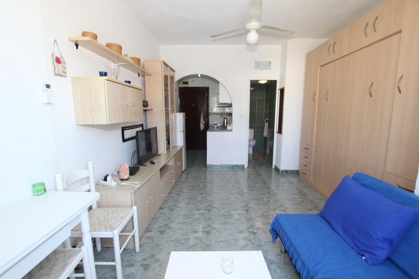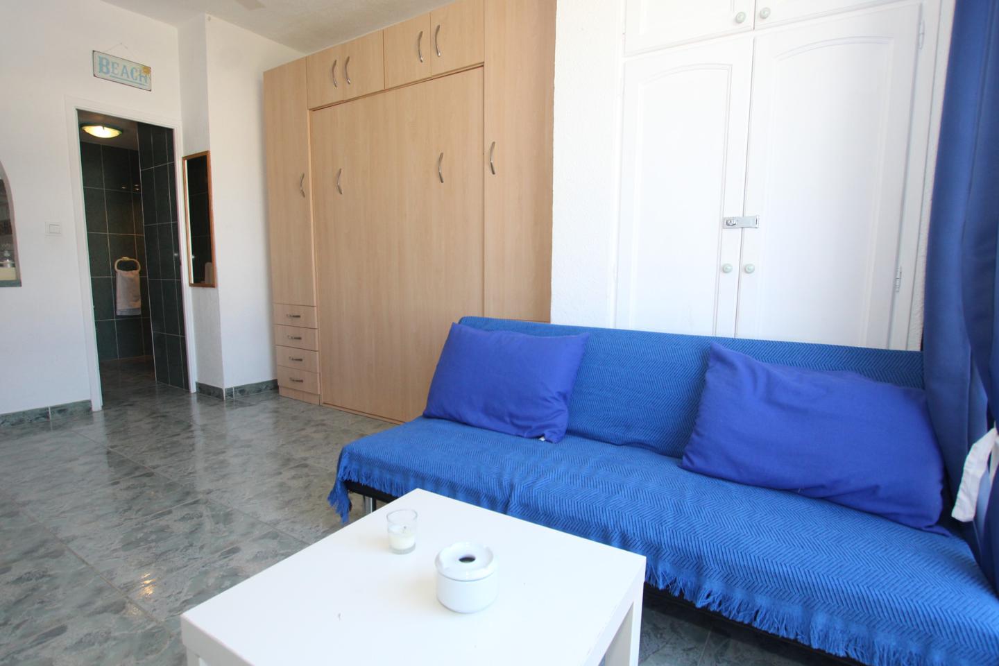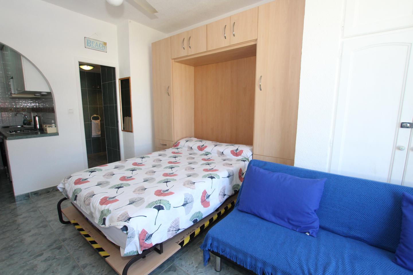 ESTUDIO LARGA TEMPORADA EN LOS ÁLAMOS. Situado en zona los Álamos, completamente amueblado y equipado, con cama de matrimonio y sofá cama. Cocina, baño y terraza incorporada al salón. Urbanización privada con jardines y piscina comunitarios. Se encuentra cerca de todos los servicios.