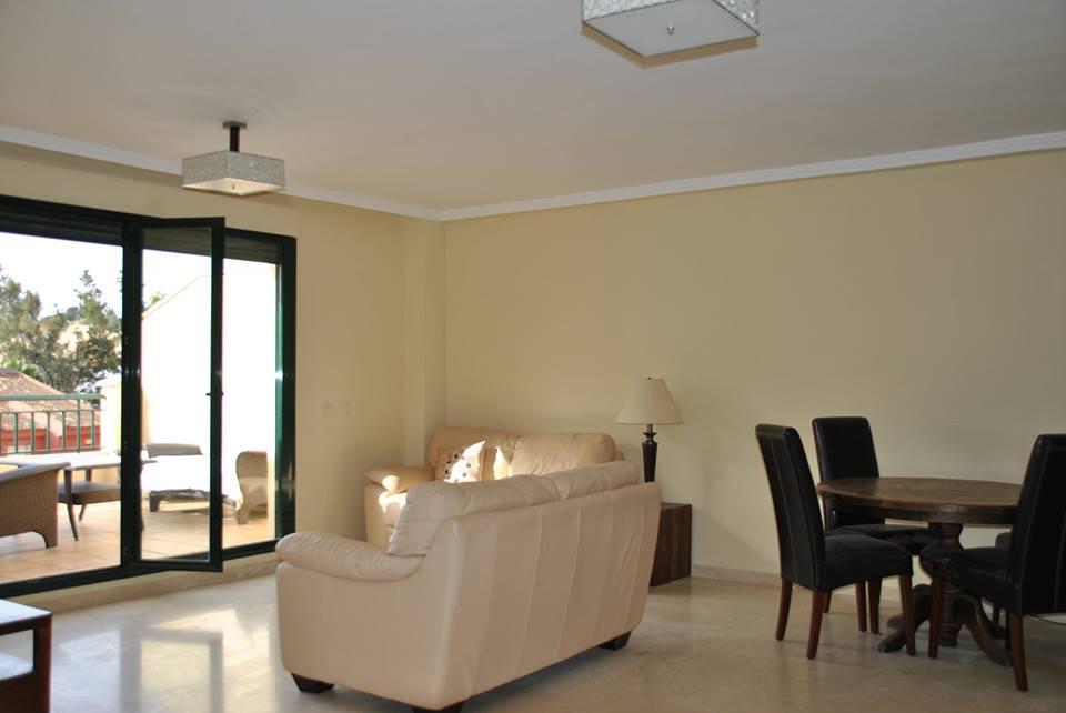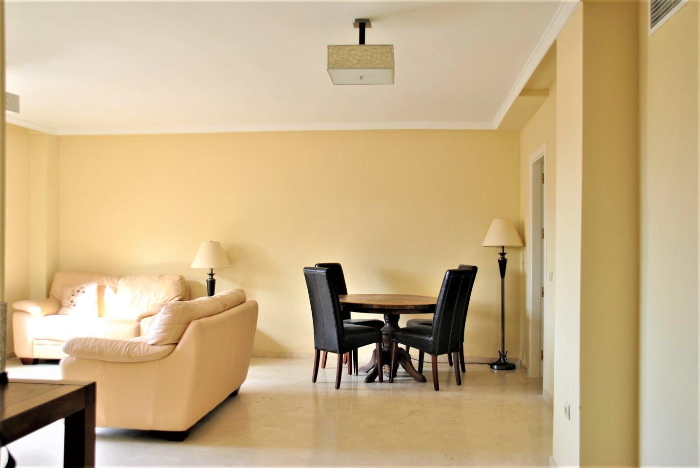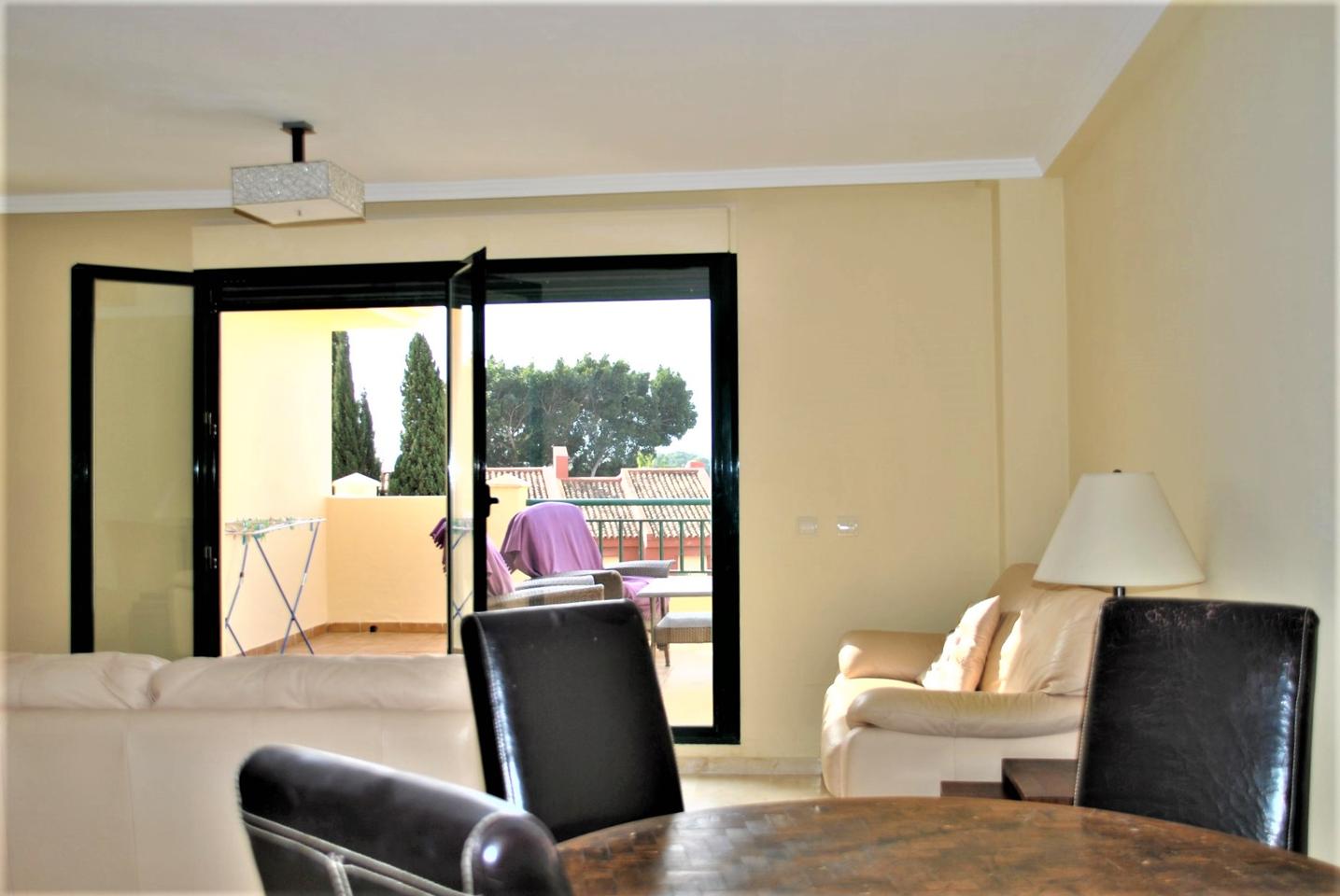 CAMPO GOLF 2 DORMITORIOS!! 100 m2. Amplio y bonito piso de 2 dormitorios con armarios empotrados, 2 baños en suite, cocina independiente amueblada con lavadero, hall de entrada con buen armario, salon muy amplio y luminoso, bonita terraza de 20 m2 con preciosas vistas al campo de golf y piscina, 2 plazas de garaje incluidas en el precio, pequeño gimnasio, aseos comunitarios, Urbanizacion residencial muy tranquila con piscina y jardines comunitarios.