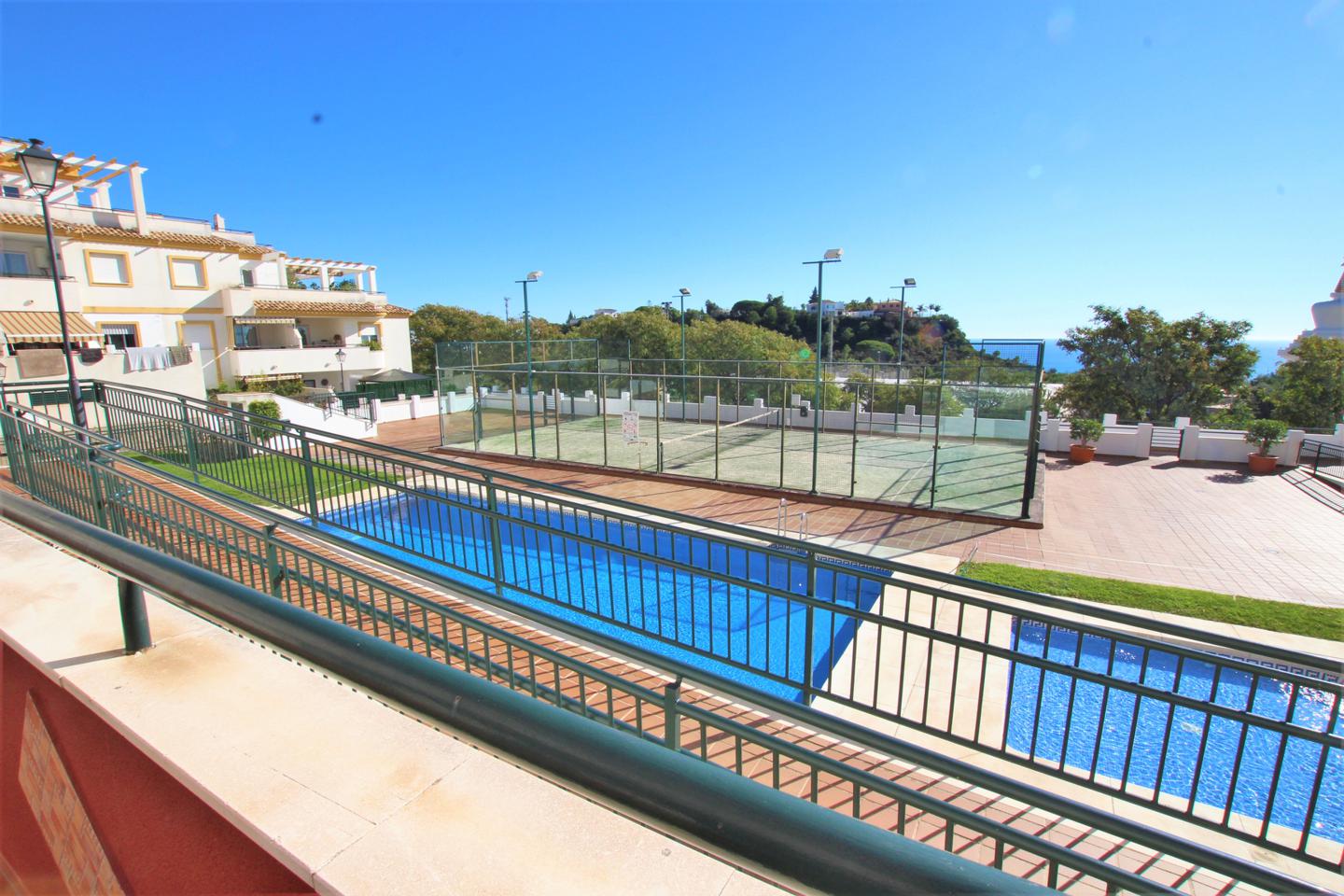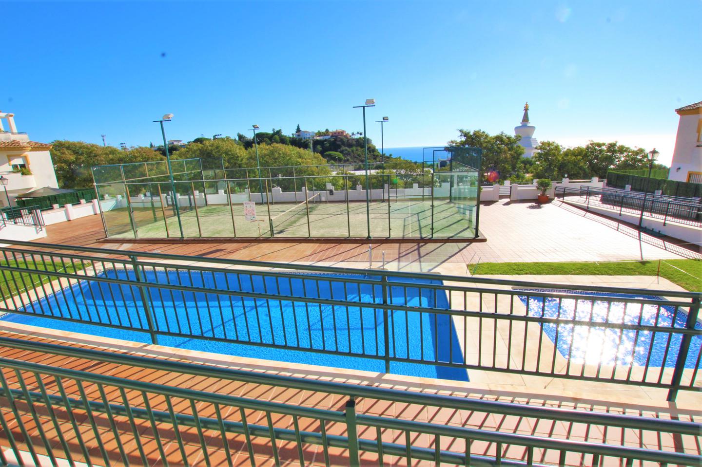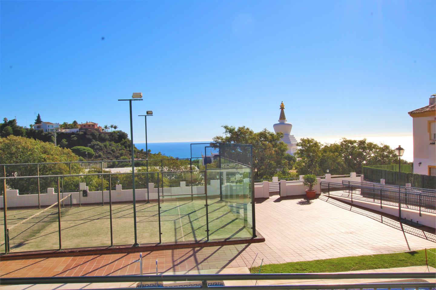 Precioso piso en planta baja con gran terraza de 50 metros, soleada con preciosas vistas al mar y estupa budista, consta de halla de entrada, cocina independiente amueblada, salon comedor, 3 dormitorios con armarios empotrados, 2 baños con ventana. Todo exterior ya que hace esquina, en urbanización privada que cuenta con, pista de paddle, pscinas y jardines comuitarios. Con 2 plazas de garaje y trastero.