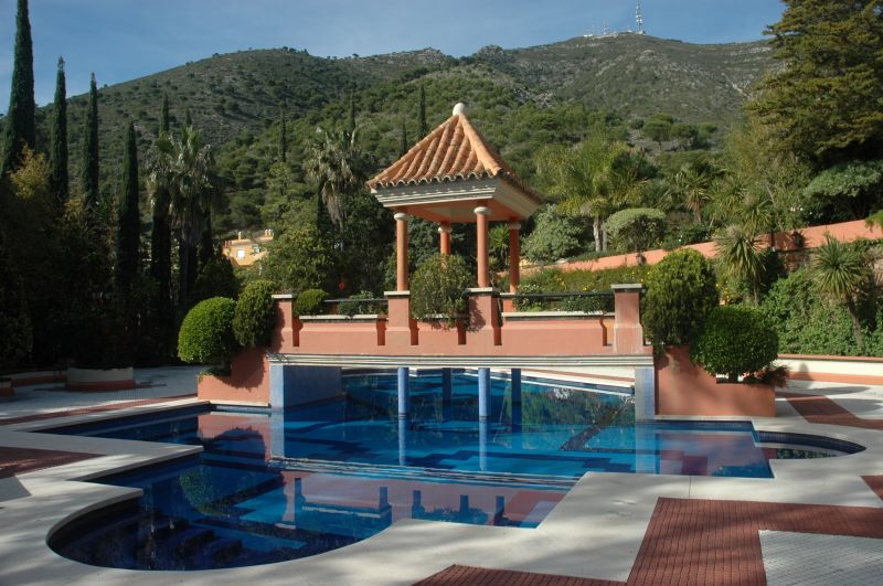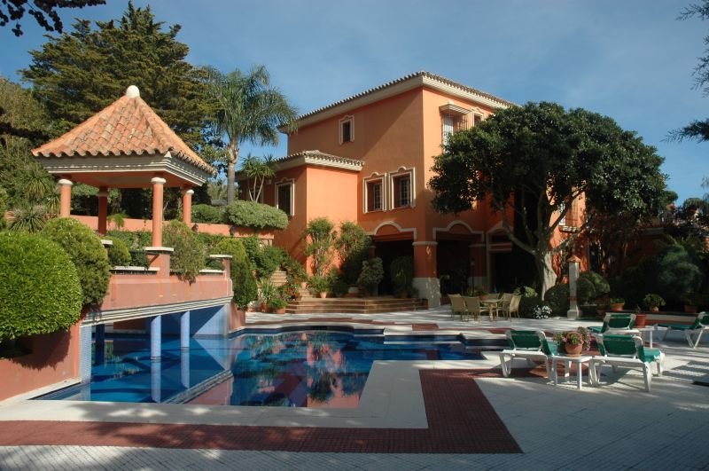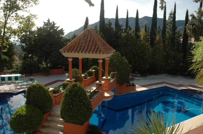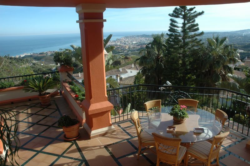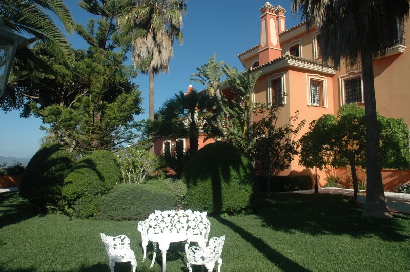 Magnífico chalet con jardines de más de 3500 m2 con iluminación. La casa consta de: - Semi-sótano  con bodega, 2 vestíbulos, 2 aseos, bar/comedor, sala de estar, dormitorio, cuarto de roperos, sala de instalaciones y taller. - Planta baja: vestíbulo, sala de estar, salón, aseo, cocina con despensa, cocina con desayuno, lavadero con tendedero, dormitorio de servicio con sala de estar , baño y garaje para 2 vehículos. -Primera planta: vestíbulo, dormitorio principal con 2 baños y 2 vestíbulos, otro dormitorio-vestidor, baño y otros 2 dormitorios con baño. Además el chalet esta equipado con aire acondicionado central, placas solares, una piscina de 230 m2 (barreras y cámaras de seguridad) y 2 patios de acceso ajardinado. Vistas panorámicas del mar y los pueblos de Mijas y Fuengirola, sin posibilidad de quedar interrumpido por otras edificaciones.