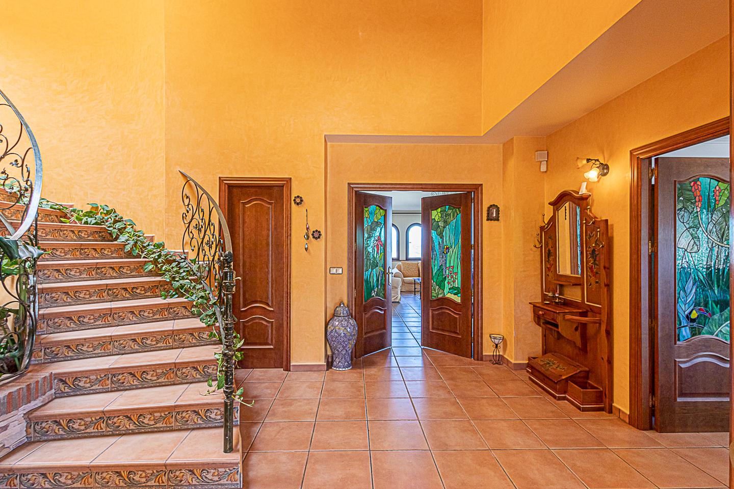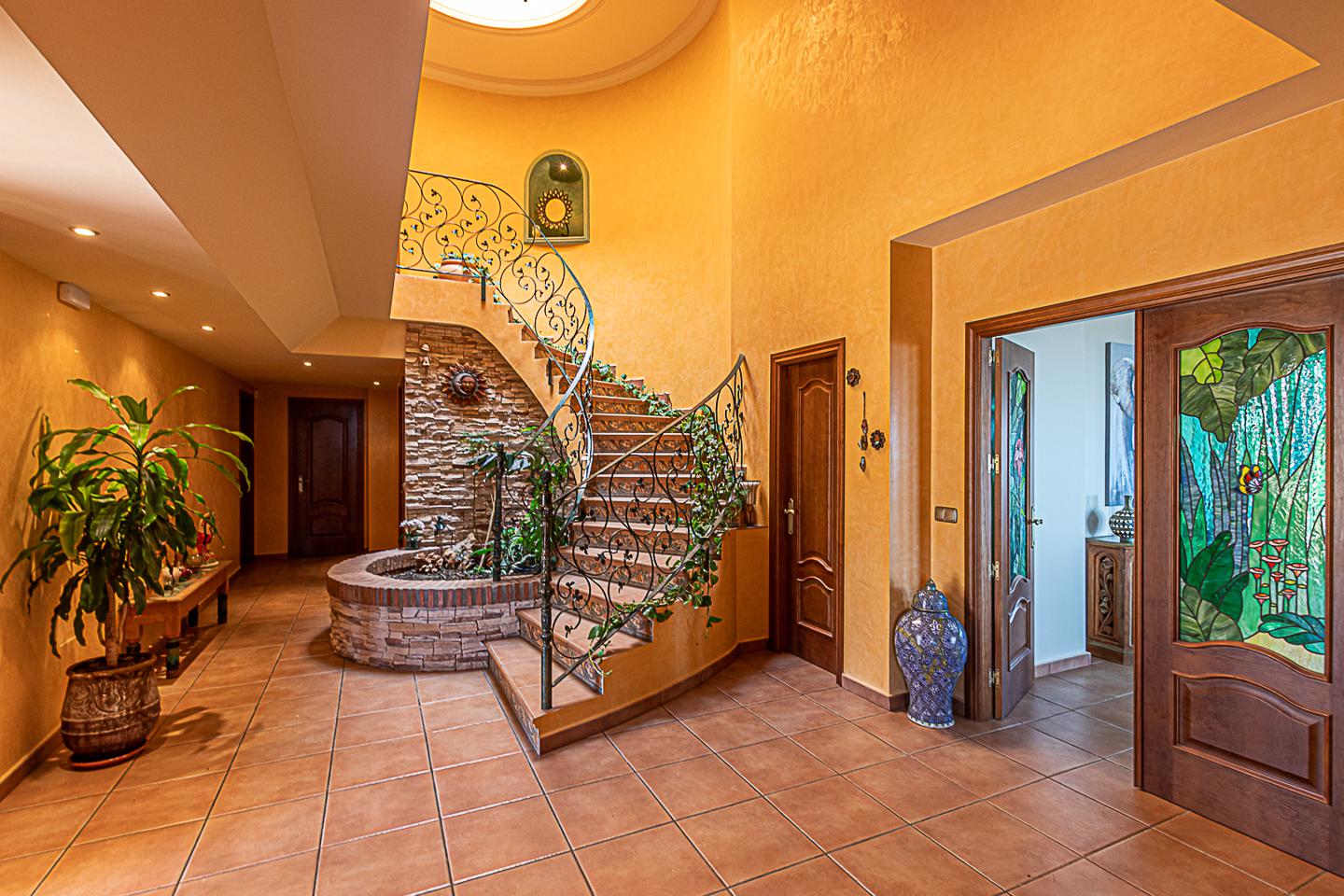 Consta de 452 m² construidos, distribuidos en tres plantas de altura. En la planta de acceso a la vivienda dispone de un señorial distribuidor a doble altura, con escaleras de intercomunicación que ofrecen un carácter único a la vivienda, bordeando un pulmón vegetal interno, un gran salón-comedor vinculado a una agradable terraza exterior con vistas panorámicas, dos amplios dormitorios, de los cuales uno conecta dicha planta con un despacho de la planta superior, dando acceso a otra fabulosa terraza. En la misma primera planta cuenta con un cuarto de plancha y lavadero. Un baño completo y otro baño de cortesía.