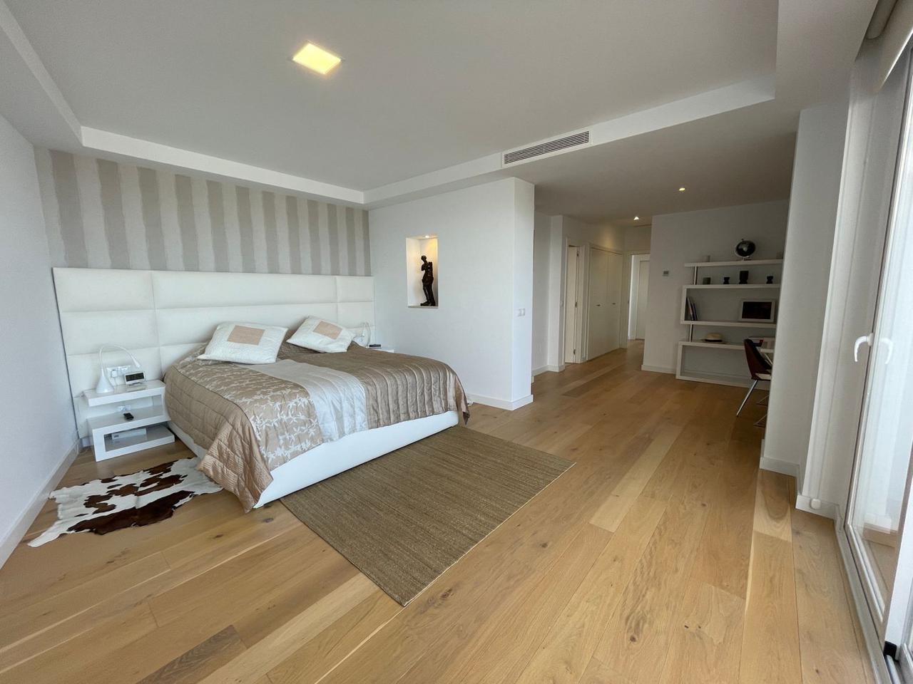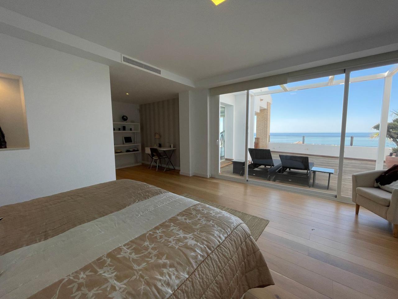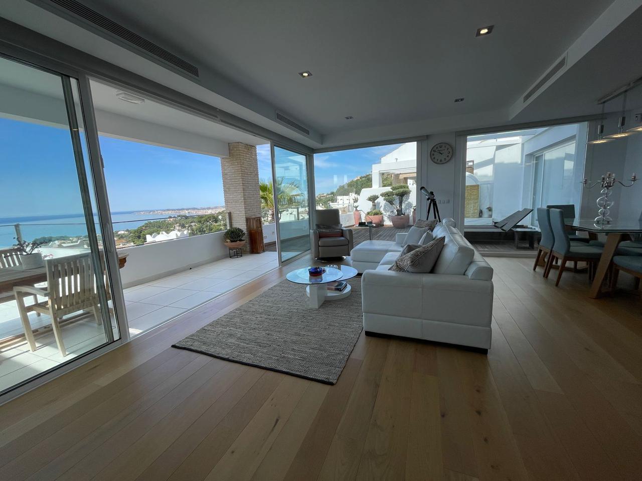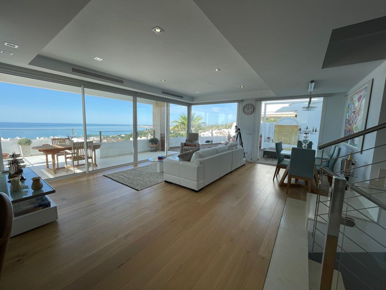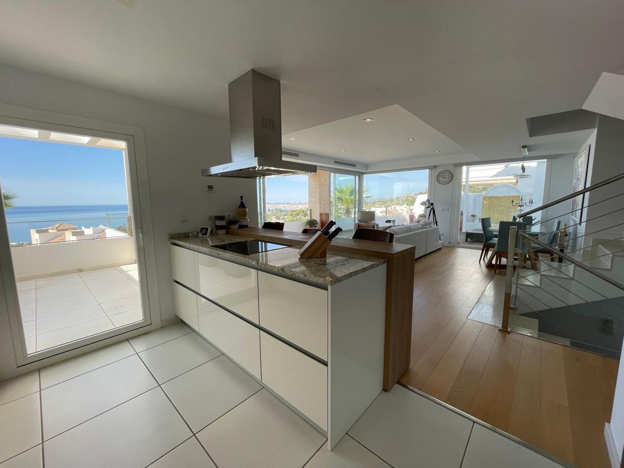 Consta de 4 dormitorios con 4 baños completos en suite y terraza privada cada uno de ellos, aseo, cocina abierta totalmente equipada a uno de los salones (ya que dispone de dos) jardín, trastero, garaje cerrado privado y también con vistas espectaculares al mar.