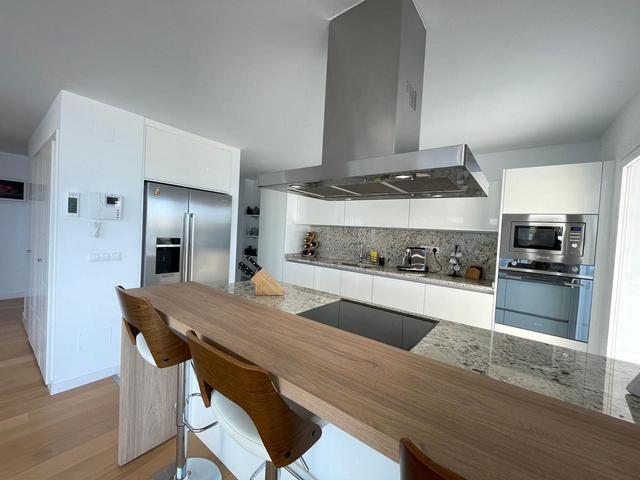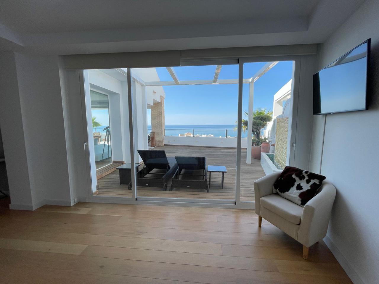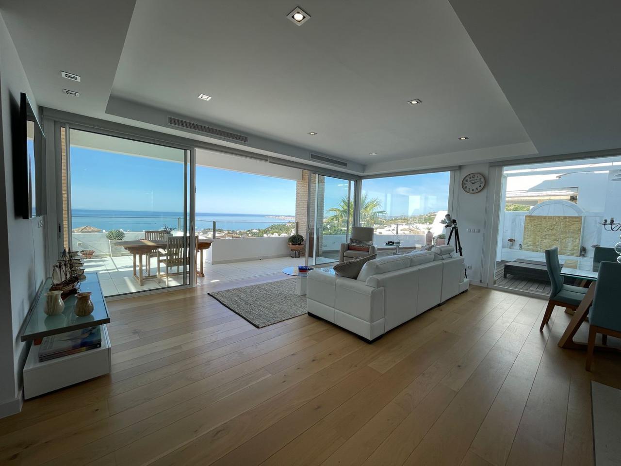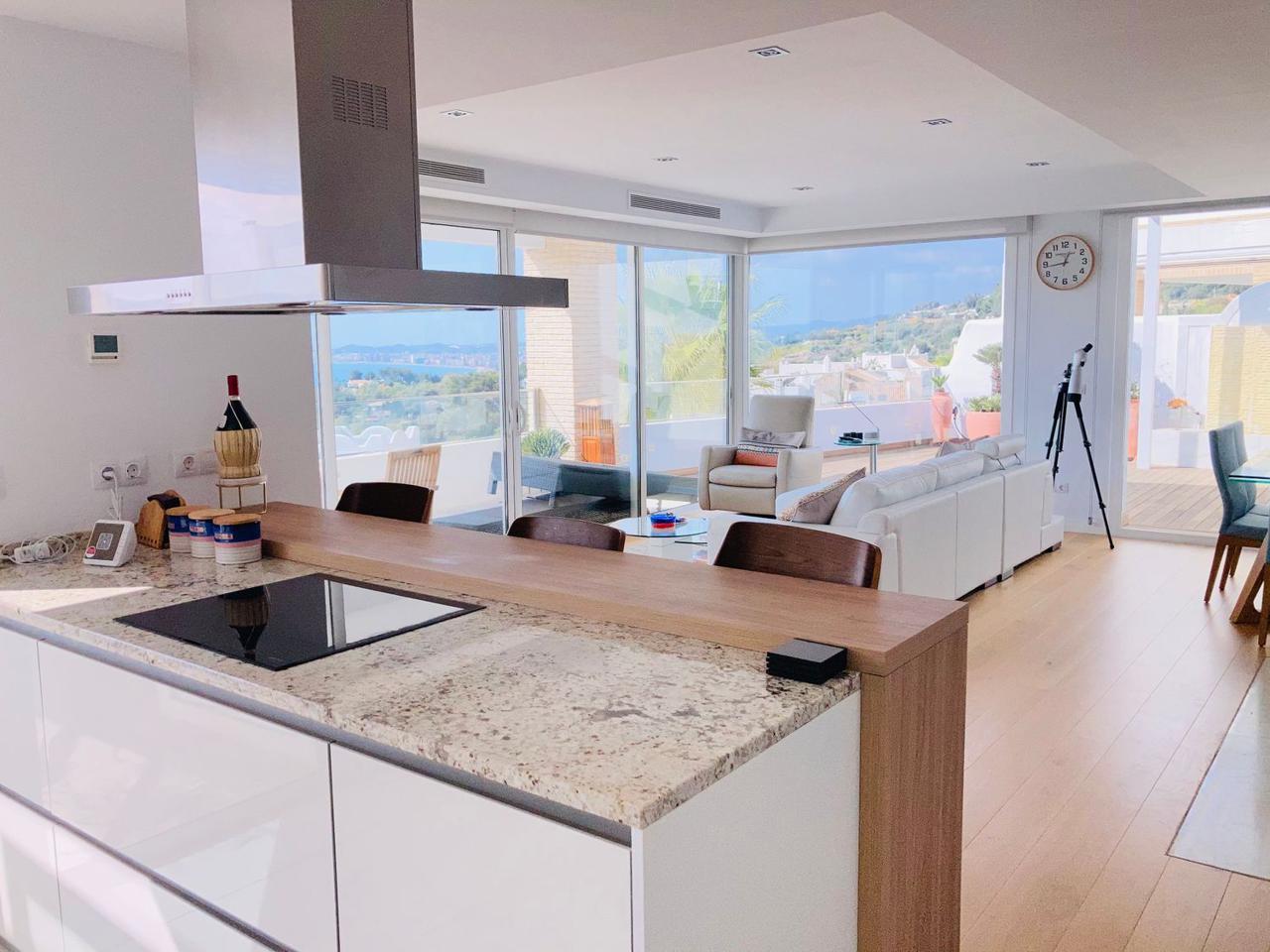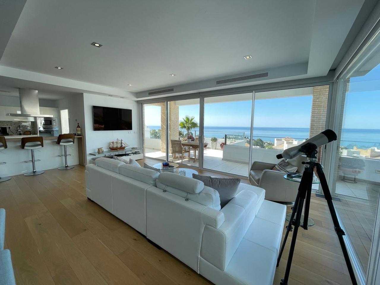 Consta de 4 dormitorios con 4 baños completos en suite y terraza privada cada uno de ellos, aseo, cocina abierta totalmente equipada a uno de los salones (ya que dispone de dos) jardín, trastero, garaje cerrado privado y también con vistas espectaculares al mar.