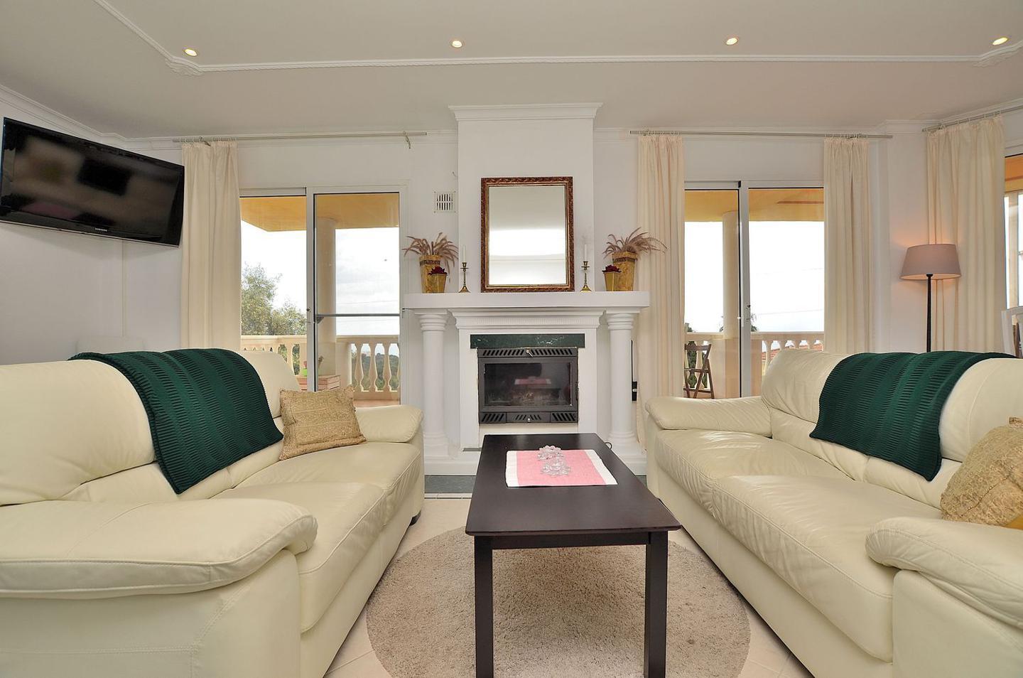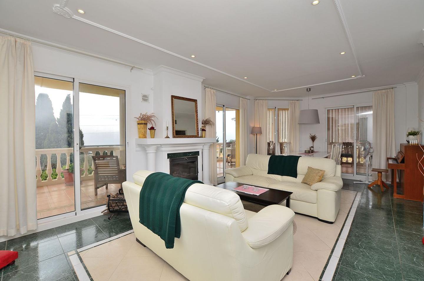 Nada más abrir la puerta de la casa nos da la bienvenida un salón con chimenea de 31m2 y vistas al mar con grandes ventanales, acompañado de una gran terraza de 150m2 con diferentes zonas donde pasar las mejores veladas contemplando el privilegio de tener esas vistas garantizadas.